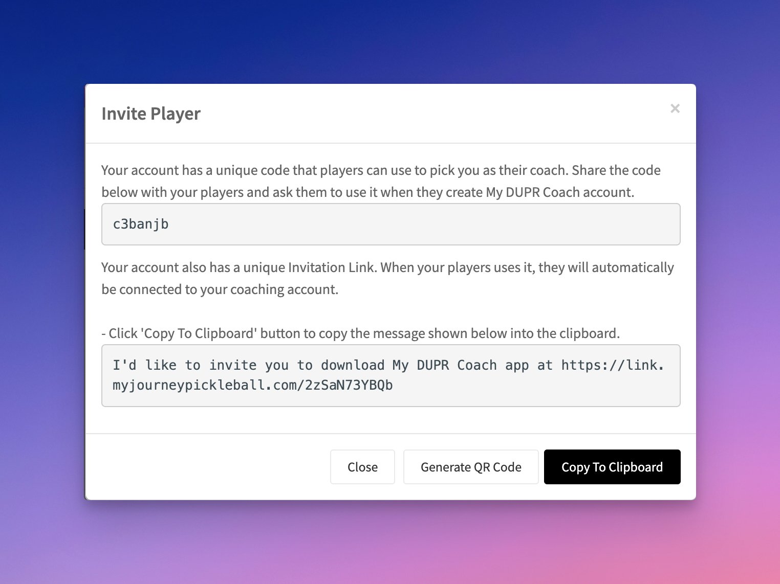 - When the modal opens, share your unique Coach Code with your players so they can connect to your team when creating their My DUPR Coach app accounts. You can also click "Copy to Clipboard" to copy a short message with your unique link and share it via any messaging app. Alternatively, click "Generate QR Code" to create a QR code that players can scan directly from your phone to join your team.